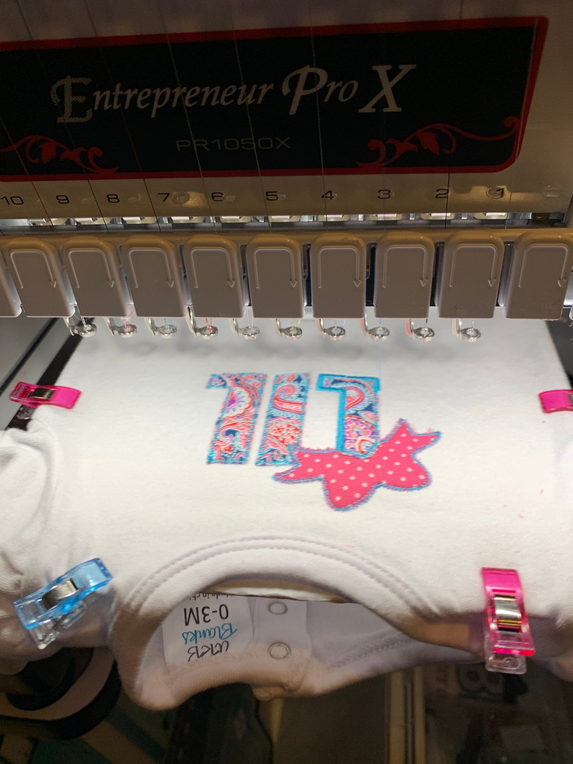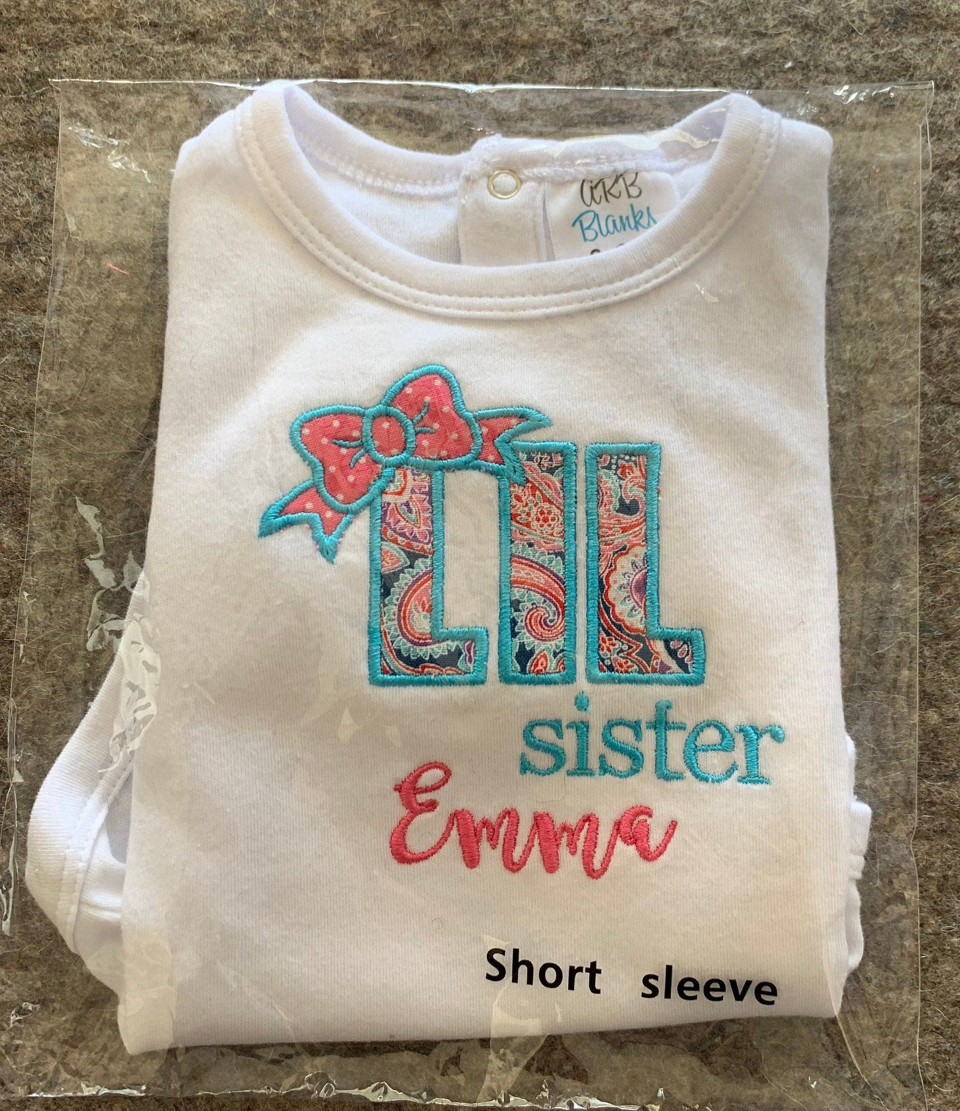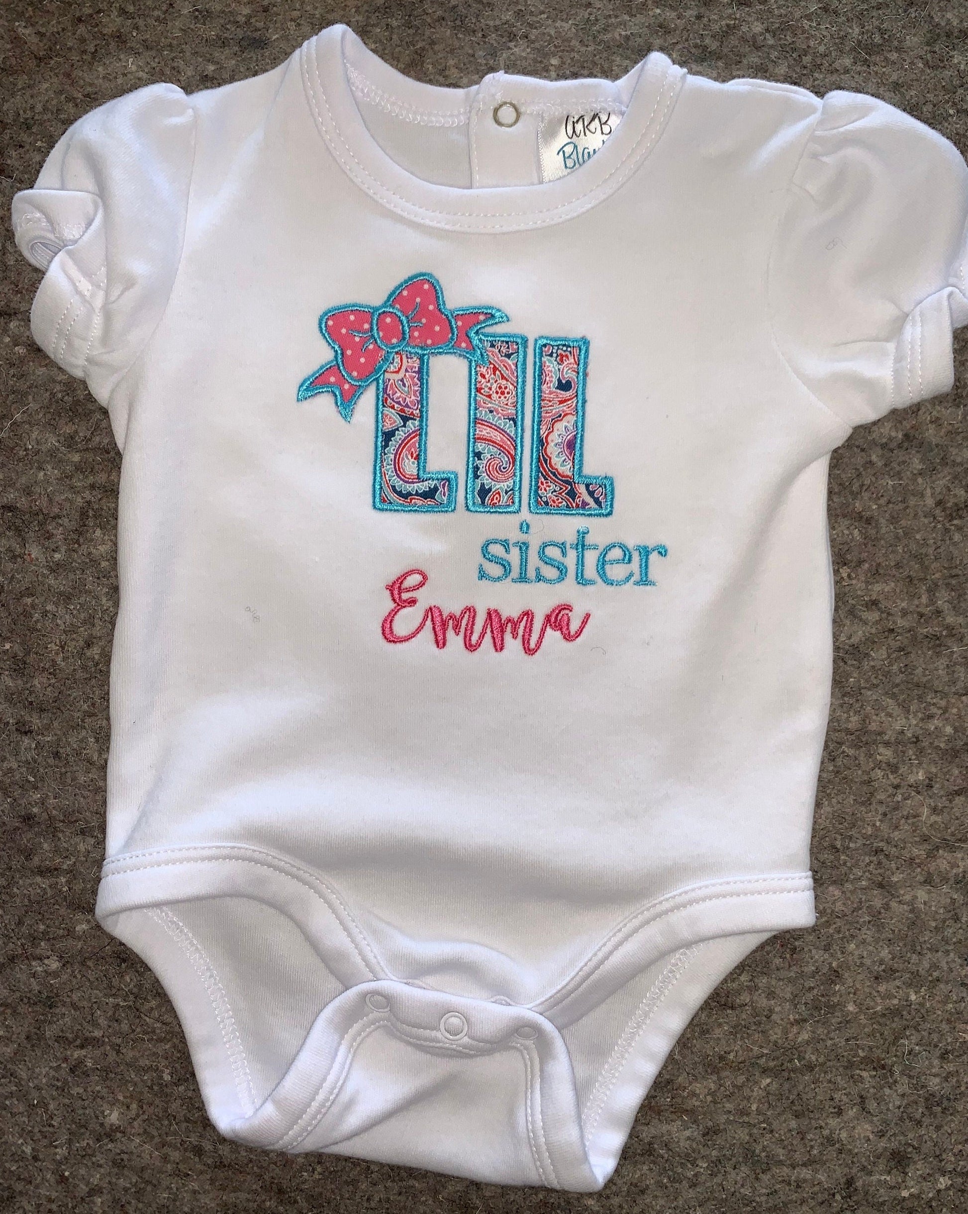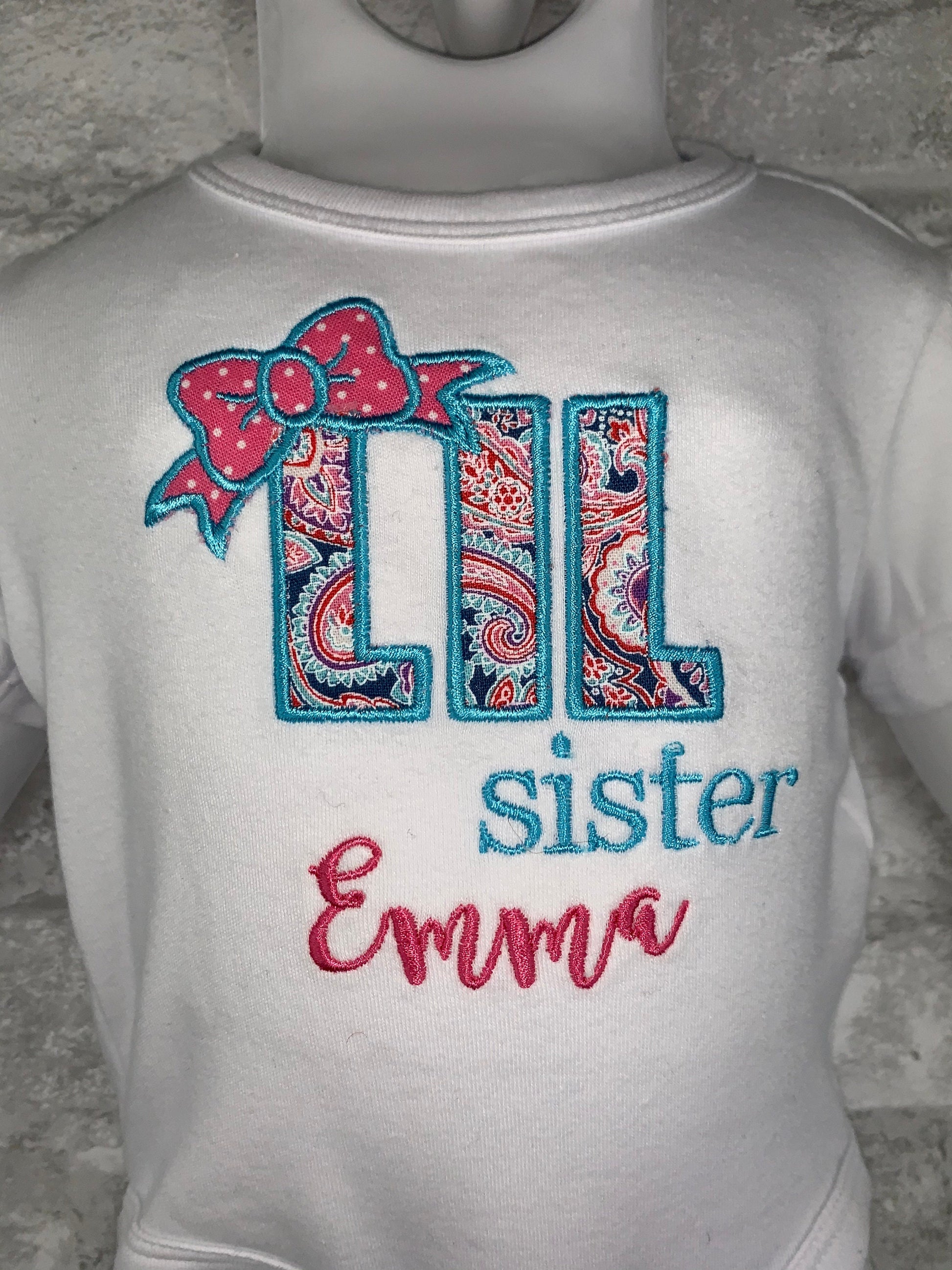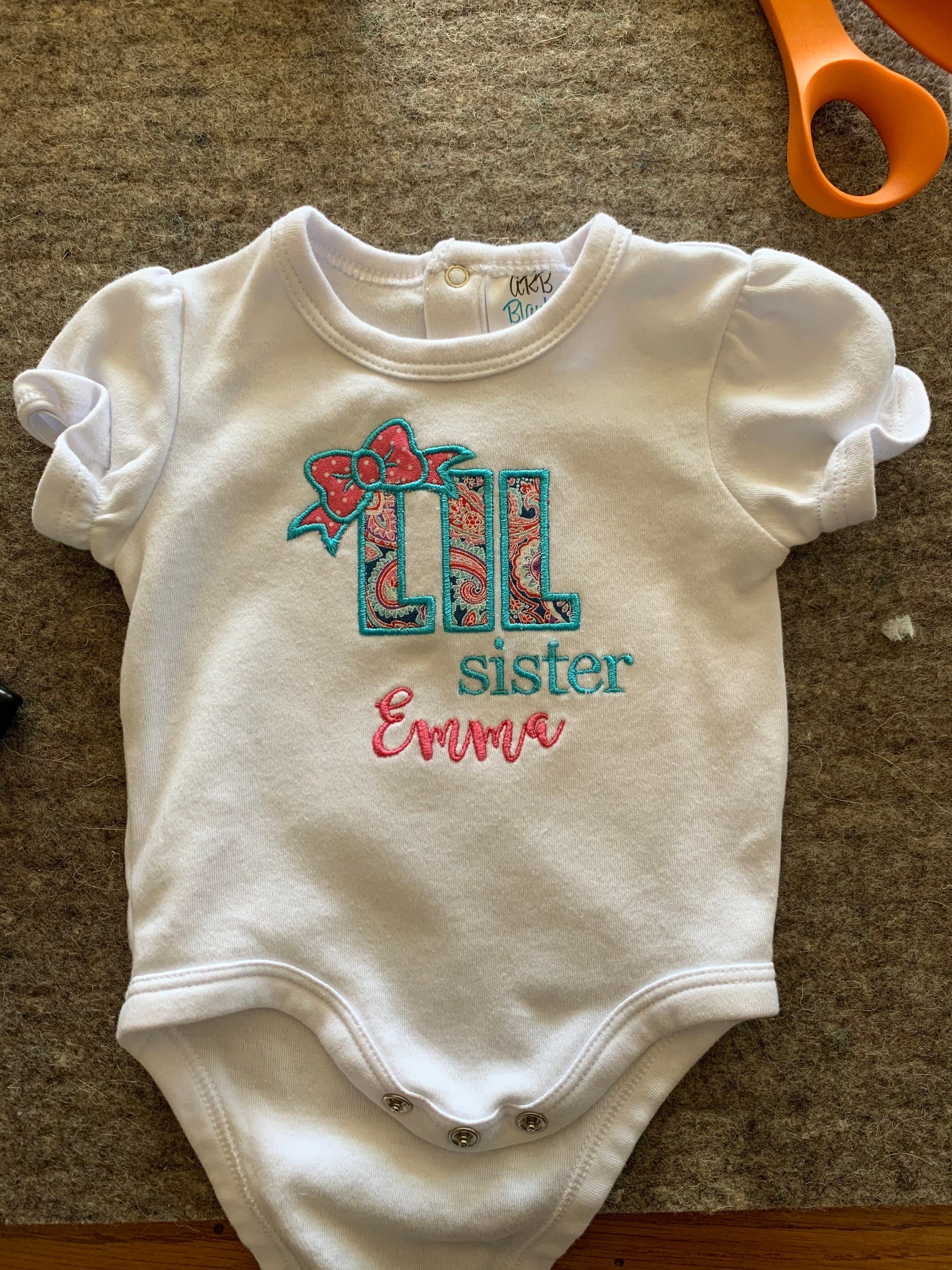 Embroidered Little Sister Shirt with paisley fabric appliqué. stitched with Madeira rayon embroidery thread, cut away stabilizer, tender touch backing.